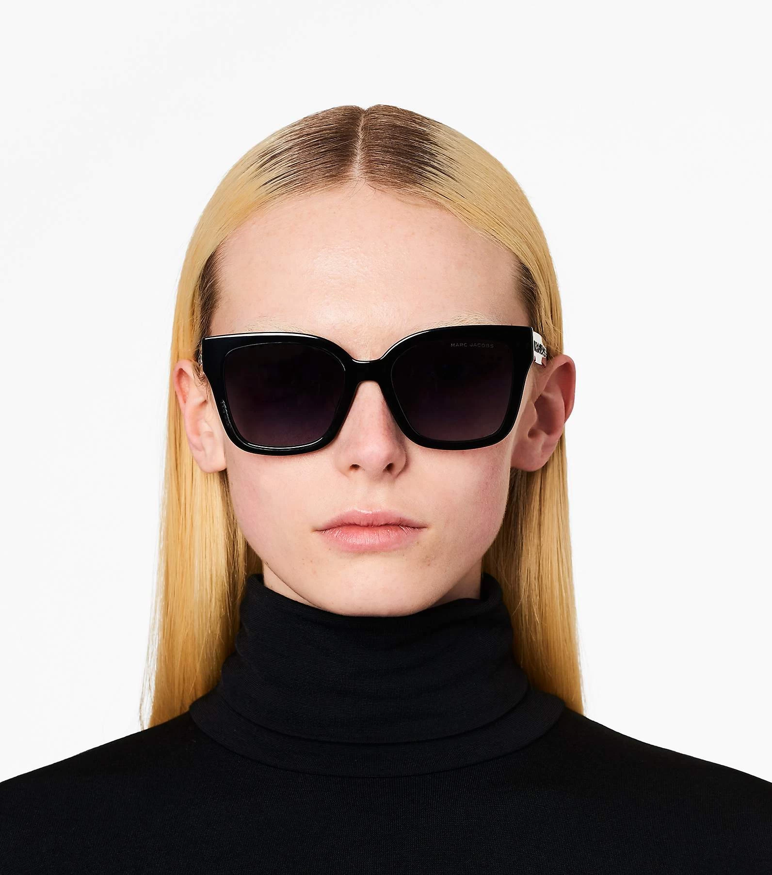 Classic square frame sealed with a tonal raised Marc Jacobs logo on the temples.