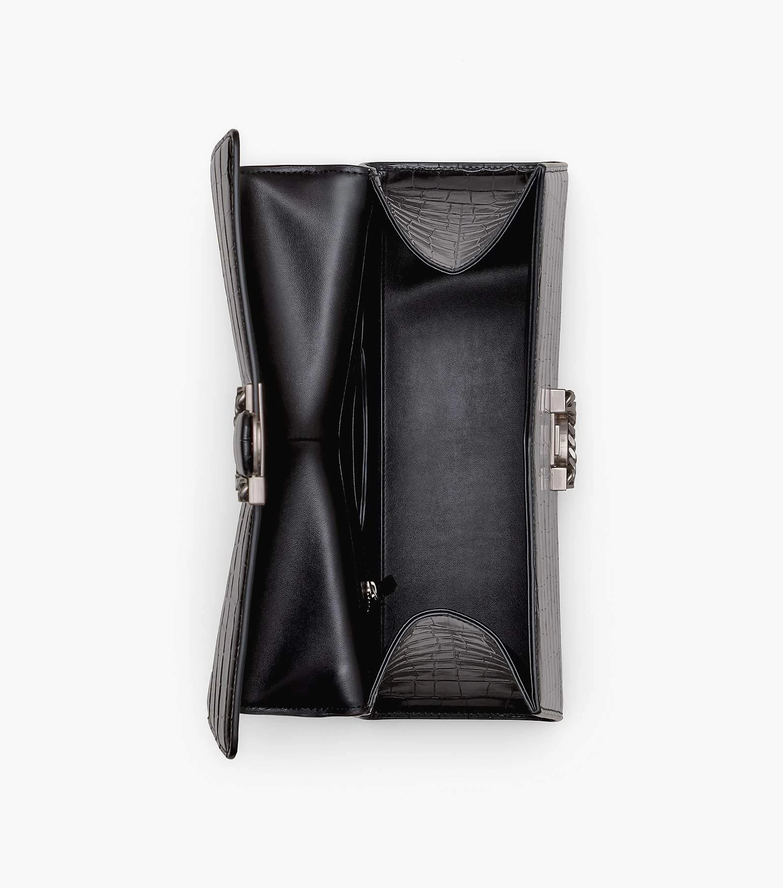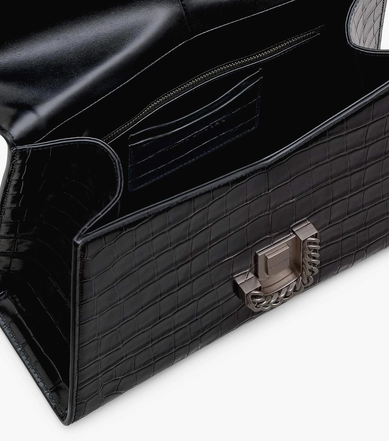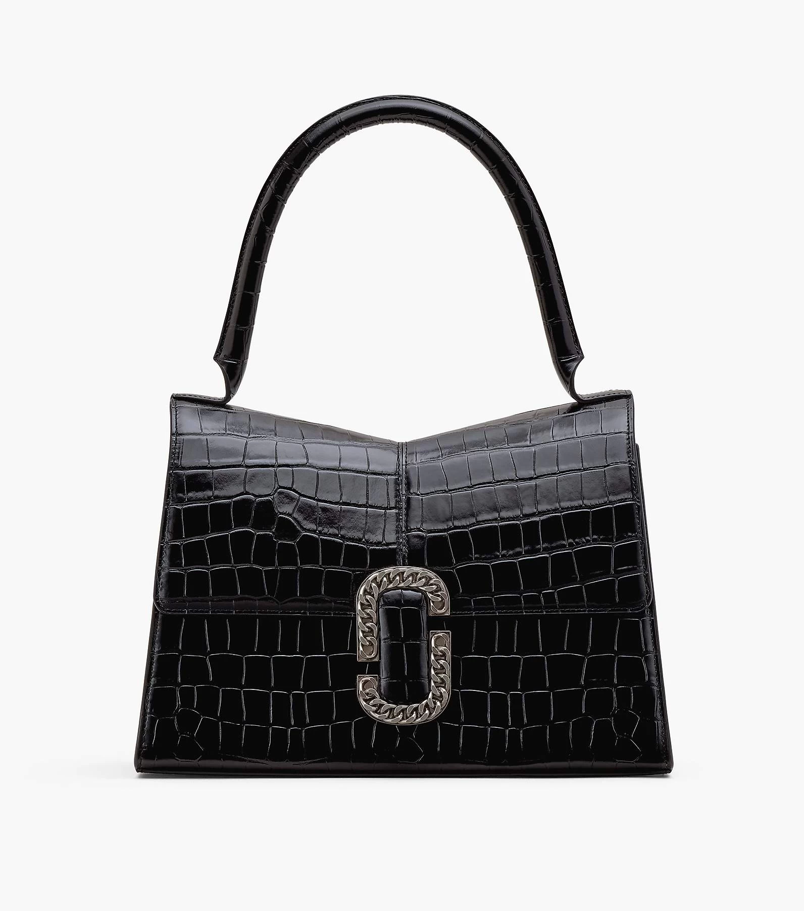 The runway-inspired St. Marc bag goes mega. This larger version of the polished top handle is crafted in glossy croc-embossed leather. It’s designed for a distinctive “M” shape and is crowned with chain link J Marc hardware at front. Inside, it includes an interior zip pocket and two card slots for easy organization. Wear yours either by carrying at the top handle or wear it over your shoulder for hands-free styling.