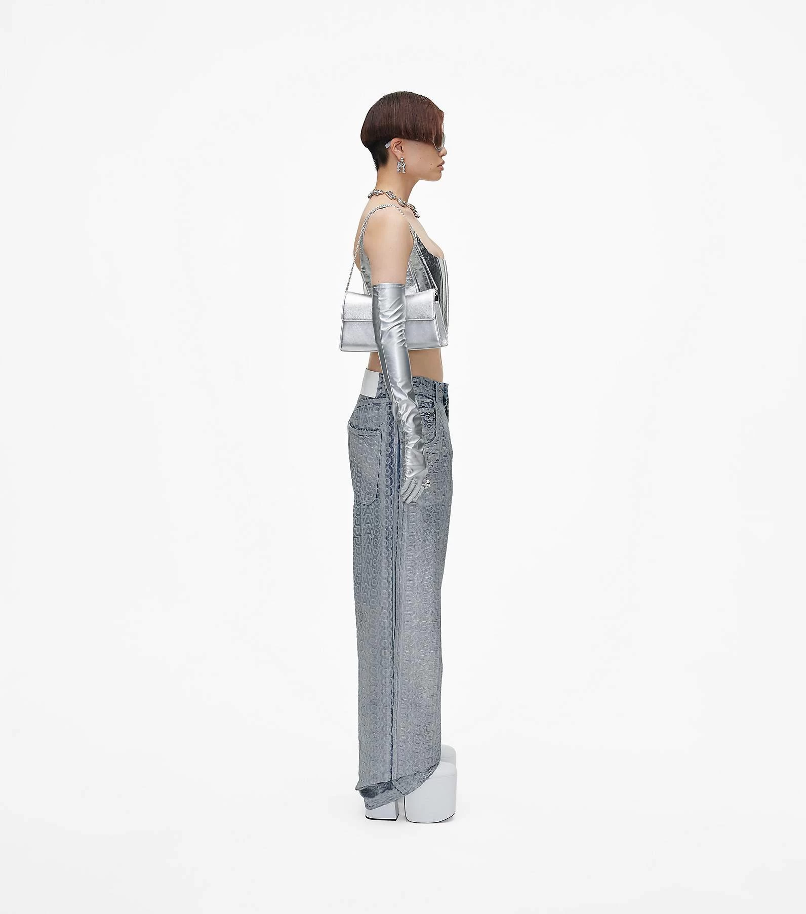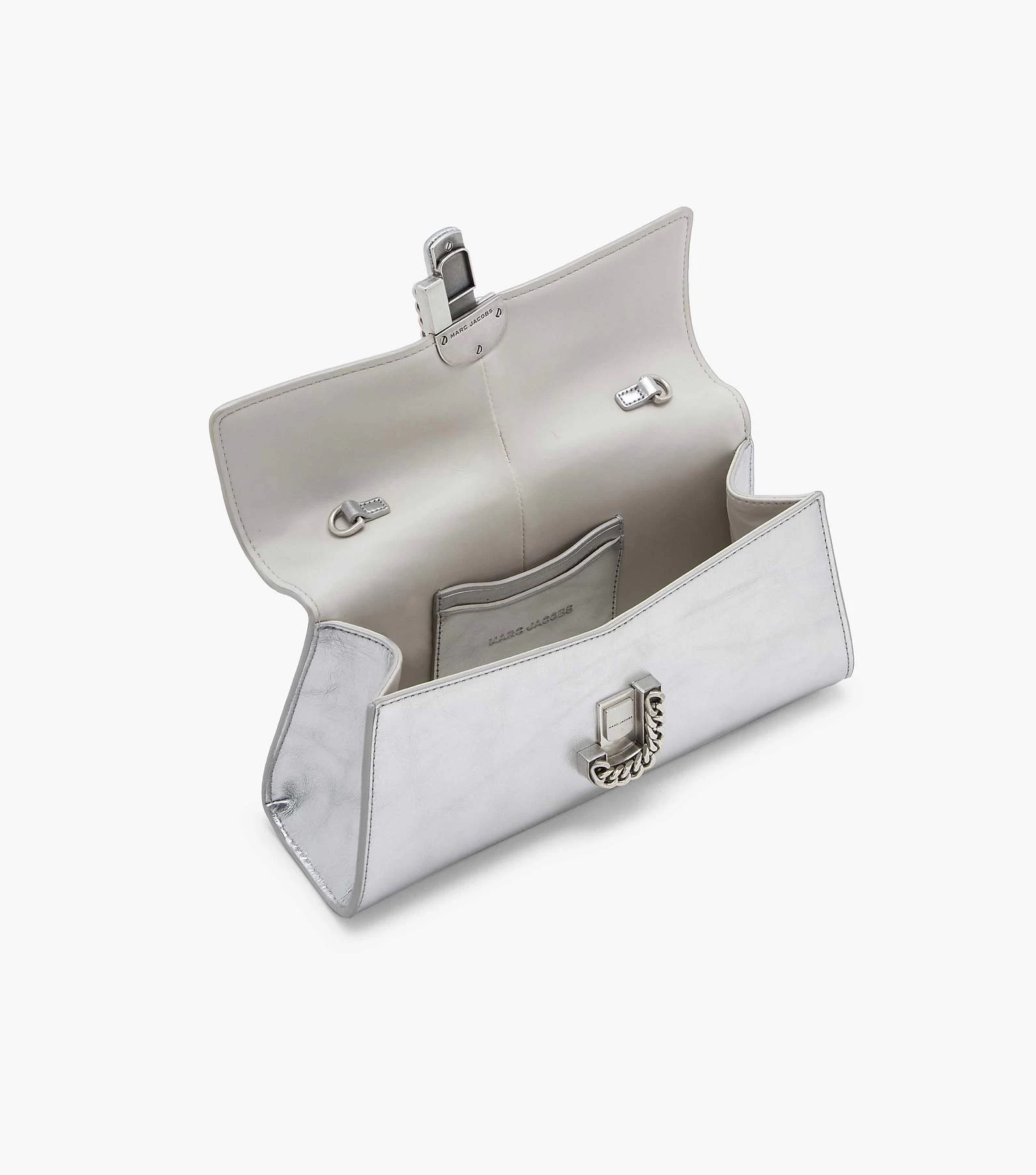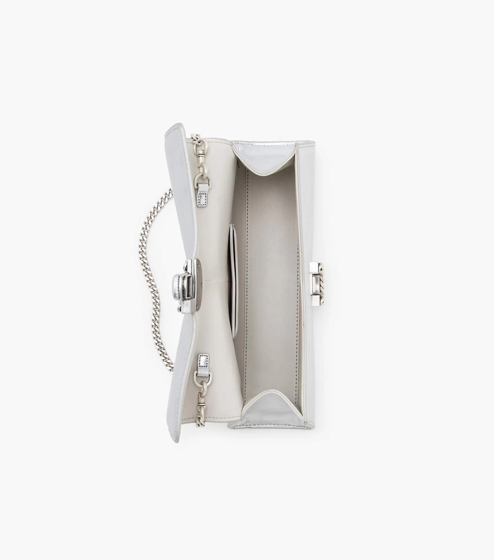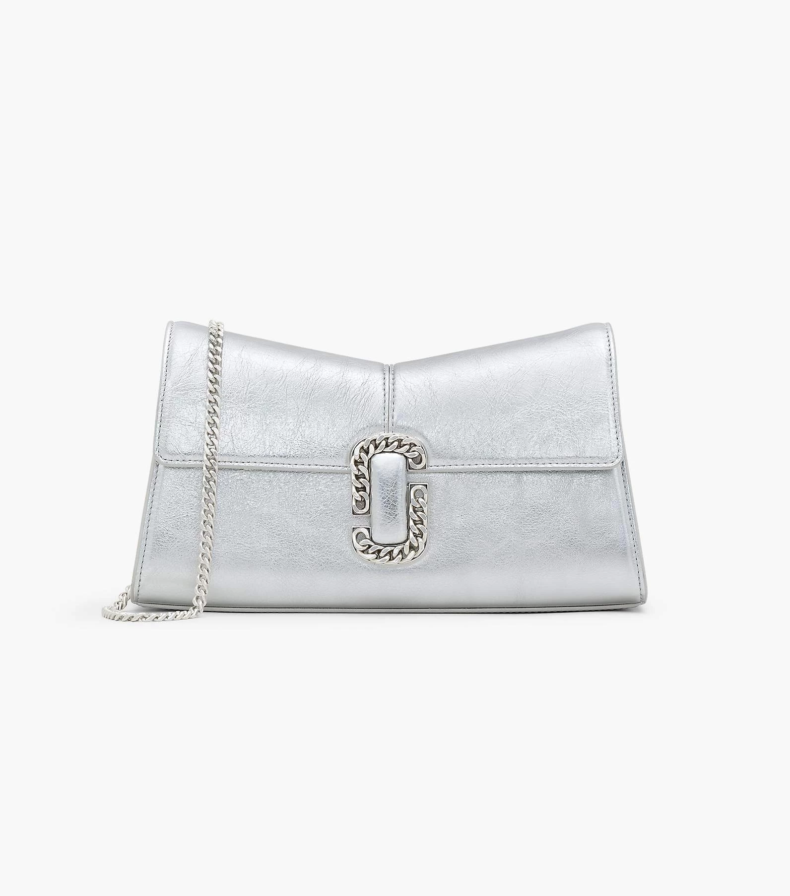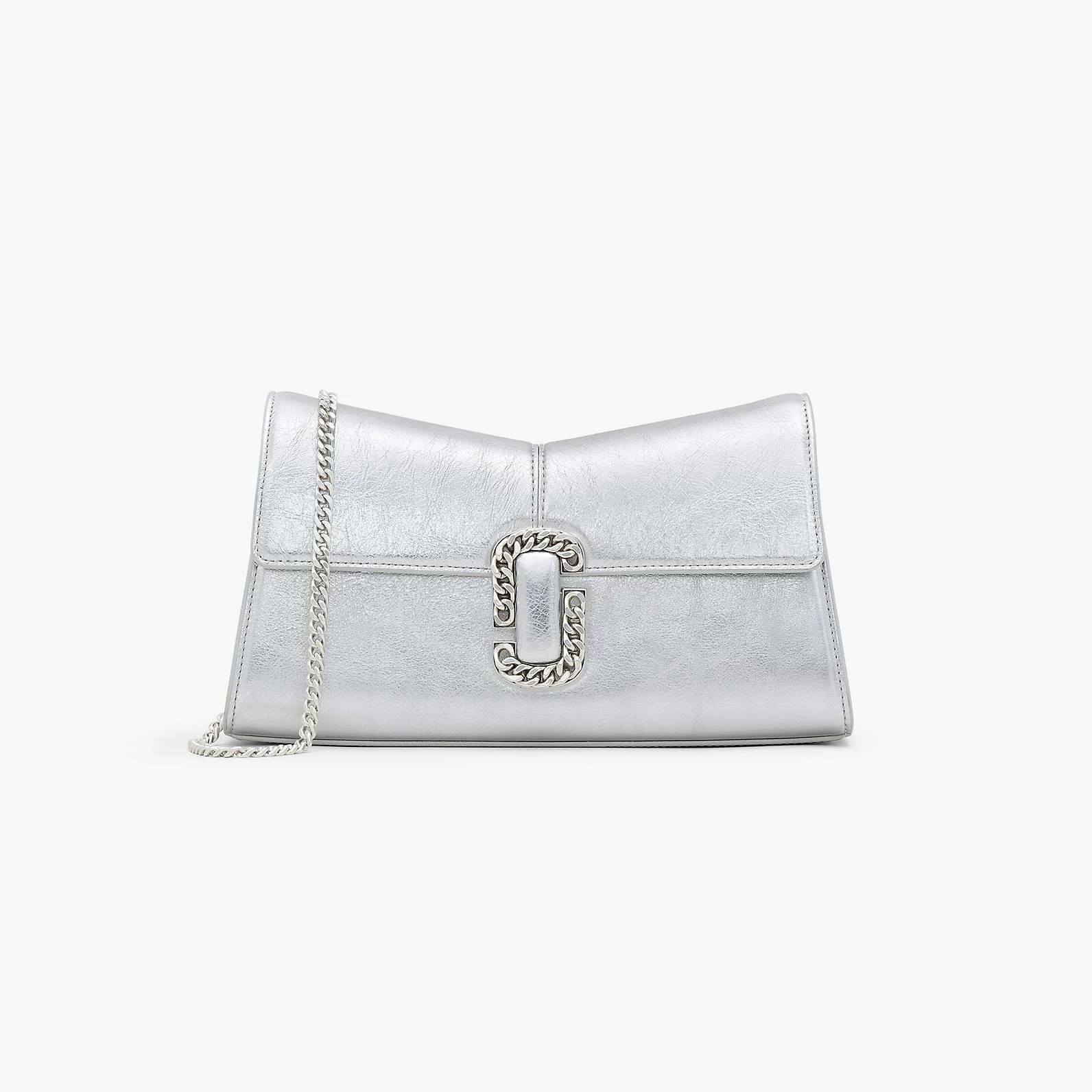 This bold iteration of the runway-inspired St. Marc clutch is refreshed in striking metallic silver leather. It’s designed for a distinctive “M” shape and is crowned with chain link J Marc hardware at front. Inside, it includes two card slots for easy organization. Style yours two ways: either attach the removable chain shoulder strap or go strapless and wear as a clutch.