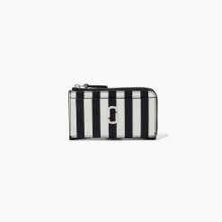This version of our top zip wallet is crafted in the season’s monochrome stripes inspired by designs from the Spring/Summer 2013 runway and finished with our exclusive J Marc hardware at front. Inside, it includes four card slots, two slip pockets, and one interior coin pouch. For added convenience, there’s a removable dog clip at back for your keys. Complete the set with the matching handbag.